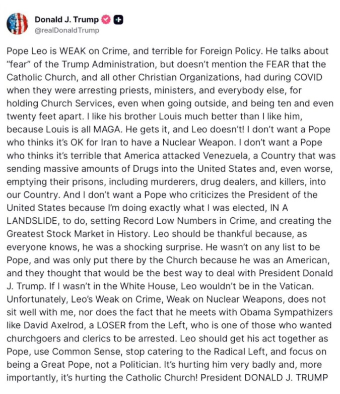 President Donald Trump responds by calling Pope Leo XIV weak, telling him to “stop catering to the Radical Left,” dismissing him outright, “I’m not a fan of Pope Leo.”